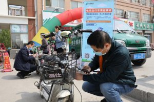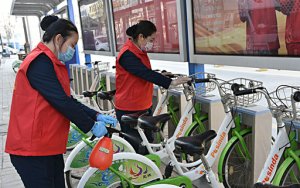 甘肅:郵儲(chǔ)青年志愿者為公共自行車消毒