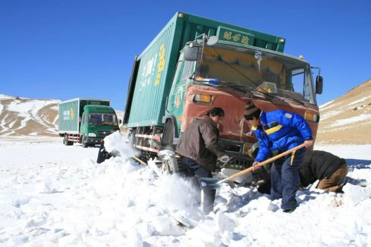 郵車拋錨,桑布和同事正在抓緊鏟雪