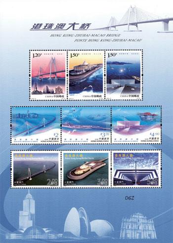 中國(guó)郵政定于10月30日發(fā)行《港珠澳大橋》紀(jì)念郵票一套3枚,郵票圖案名稱分別為:青州橋、東人工島和海底隧道。同時(shí),中國(guó)郵政與香港郵政、澳門郵電共同印制同題材郵票小全張1枚,內(nèi)含中國(guó)郵政、香港郵政、澳門郵電郵票各3枚。