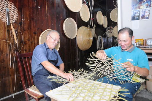 進入“非遺”文化館,王曉豐的話明顯多了起來:“父親的店以前在鎮(zhèn)東頭,搬到這兒也是近兩年的事兒。你們看這些大大小小的竹編制品,有果品盤、飯罩、魚簍等。我祖上就是做竹編的,父親從小就耳濡目染學習竹編。竹編從選竹、鋸竹、破竹到編織、刷磨,再到竹編成品,一套流程下來10多個步驟都是他親自完成,一個成品少則需要三五天,多則要幾個星期甚至一個月。”王曉豐搬了張小凳坐在父親身旁,“我平時工作忙,難得有空過來?!?/p>