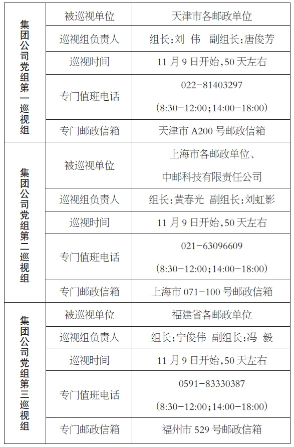 集團(tuán)公司黨組首批巡視對集團(tuán)公司天津市、上海市、福建省分公司,郵政儲蓄銀行天津、上海、福建省、廈門分行,中郵人壽保險公司天津、上海分公司,中郵證券公司上海、福建分公司,中郵科技有限責(zé)任公司等12個單位的黨委(黨組)領(lǐng)導(dǎo)班子及其成員開展常規(guī)巡視。