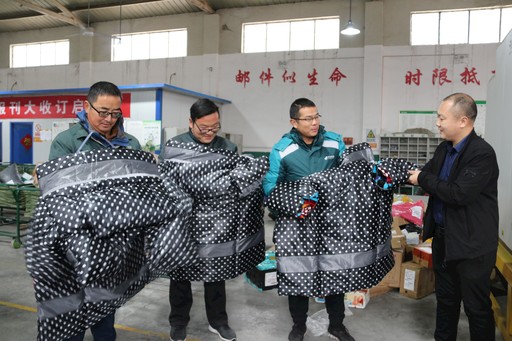 “這擋風(fēng)被真厚實(shí)?!?1月17日,河南省衛(wèi)輝市郵政分公司“三合一”郵件處理場(chǎng)地的投遞員們拿著新發(fā)放的棉帽子、棉手套、電動(dòng)車擋風(fēng)被等御寒保暖勞保用品感慨道?!鮿⑵G玲 攝