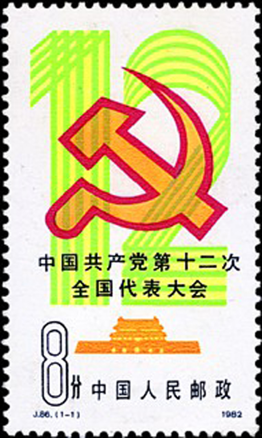 中國共產黨第十二次全國代表大會于1982年9月1日至11日在北京召開。參加這次大會的正式代表1600人(出席開幕式1545人),候補代表160人(出席開幕式145人),代表著全國3965萬黨員。該套郵票由盧天驕設計,于1982年9月1日發(fā)行。