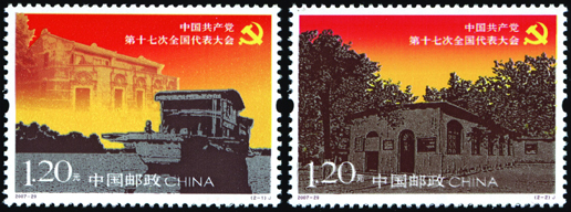 中國共產黨第十七次全國代表大會于2007年10月15日至21日在北京召開。大會主題是:高舉中國特色社會主義偉大旗幟,以鄧小平理論和“三個代表”重要思想為指導,深入貫徹落實科學發(fā)展觀,繼續(xù)解放思想,堅持改革開放,推動科學發(fā)展,促進社會和諧,為奪取全面建設小康社會新勝利而奮斗。該套郵票由陳幼林、王戈設計,于2007年10月15日發(fā)行。