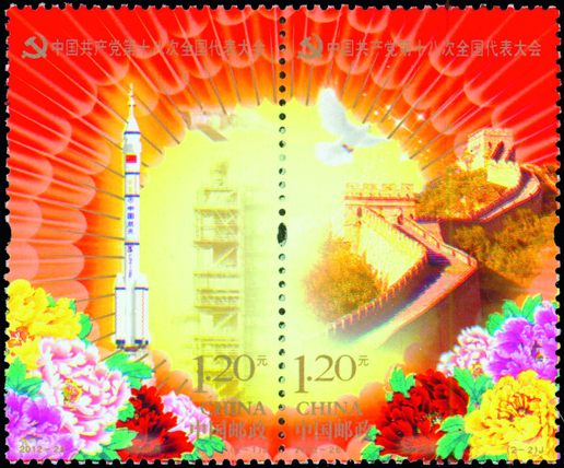 中國共產黨第十八次全國代表大會于2012年11月8日在北京人民大會堂召開。此次大會是我們黨在全面建設小康社會的關鍵時期和深化改革開放、加快轉變經濟發(fā)展方式的攻堅時期召開的一次十分重要的會議,是全黨全國各族人民政治生活中的一件大事,對我們黨高舉中國特色社會主義偉大旗幟,團結帶領全國各族人民繼續(xù)全面建設小康社會、堅持科學發(fā)展、加快推進社會主義現(xiàn)代化、開創(chuàng)中國特色社會主義事業(yè)新局面具有重大而深遠的意義。黨的十八大代表名額共計2270名,這些代表由全國40個選舉單位選舉產生。黨的十八大選舉出了新一屆的中共中央領導層。為紀念中國共產黨第十八次全國代表大會的召開,中國郵政發(fā)行紀念郵票一套2枚,小型張1枚。該套郵票由許開強、饒鑒設計,小型張由郝旭東設計,于2012年11月8日發(fā)行。