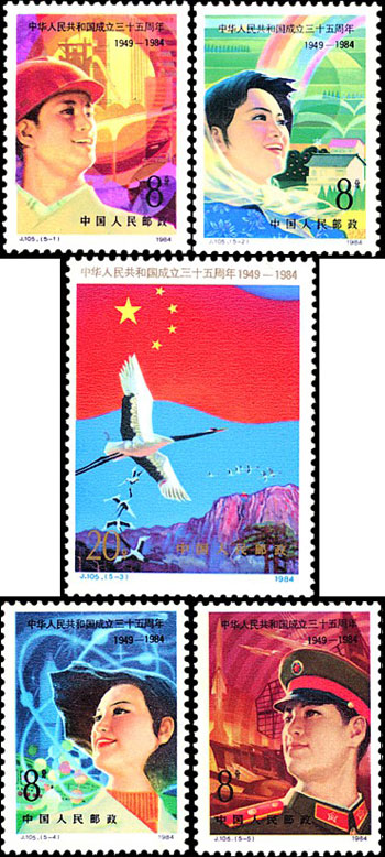 為慶祝中華人民共和國成立35周年,發(fā)行紀念郵票一套5枚,圖案分別為:壯麗的圖景、希望的田野、光輝的前程、科學的春天、保衛(wèi)你!祖國。該套郵票由陳曉聰設計,于1984年10月1日發(fā)行。