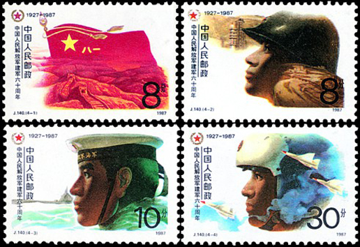 1987年8月1日,在中國人民解放軍建軍60周年之際,郵電部發(fā)行了這套以三軍士兵形象為圖案的紀念郵票,全套4枚。內容分別為:“軍魂”畫面為在長城和高山的村托下,高高飄揚的中國人民解放軍“八一”軍旗?!瓣戃姂?zhàn)士”主圖是陸軍戰(zhàn)士頭像,背景為祖國的錦繡河山及導彈發(fā)射基地?!昂\姂?zhàn)士”主圖是海軍戰(zhàn)士頭像,背景為浮出水面的潛水艇。“空軍戰(zhàn)士”主圖是空軍戰(zhàn)士頭像,背景為新型戰(zhàn)斗機。每枚郵票的左上角都有中國人民解放軍“八一”軍徽。該套郵票由劉向平設計。