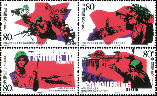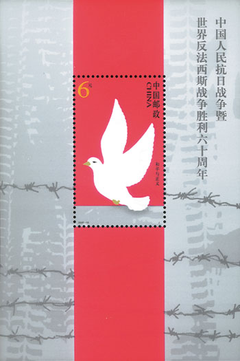 2005年8月15日,中國郵政發(fā)行《中國人民抗日戰(zhàn)爭暨世界反法西斯戰(zhàn)爭勝利六十周年》紀念郵票,一套4枚,小型張1枚,這也是第一枚抗戰(zhàn)勝利小型張。郵票內容上第一次出現(xiàn)中國以外反法西斯的戰(zhàn)場,第三枚為諾曼底登陸,第四枚為攻克柏林。小型張為和平與正義,主圖是和平鴿,背景是戰(zhàn)爭中坦克的印記以及集中營的鐵網。該套郵票由武將設計。