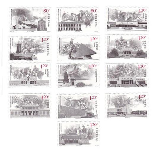 2015年9月3日,中國郵政發(fā)行《中國人民抗日戰(zhàn)爭暨世界反法西斯戰(zhàn)爭勝利七十周年》紀念郵票1套13枚,小型張1枚。該套郵票采用紀念場館與經典戰(zhàn)役場面相結合的方式,表現(xiàn)了革命英烈英勇、頑強、不畏犧牲的精神。作者采用繪畫寫實的方法,使用凝重的黑色色調,給人以一種肅穆莊嚴的感覺,銘記歷史、緬懷先烈。小型張畫面以《大刀進行曲》雕塑、長城、紅綢、和平鴿為主要元素,紅、白、灰色調的大膽運用,形成強烈的色彩反差和視覺沖擊力,現(xiàn)實主義的雕塑凝聚了抗日的決心以及全民族為勝利而歡呼的喜悅之情,與中國人民抗日戰(zhàn)爭暨世界反法西斯戰(zhàn)爭勝利七十周年紀念活動標識相互呼應,融為一體。該套郵票由李晨、于雪設計。