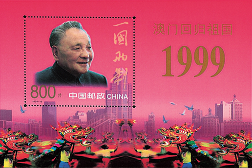 1999年12月20日,為了紀念澳門回歸祖國,國家郵政局發(fā)行了《澳門回歸祖國》紀念郵票一套2枚。郵票第一枚為“中葡聯(lián)合聲明”,畫面以《中葡聯(lián)合聲明》為中心,左下角飾以荷花襯托。第二枚為“澳門基本法”,畫面以《澳門基本法》為中心,下部飾以長城圖案。該套郵票由楊文清、張桂林設計,于1999年12月20日發(fā)行。