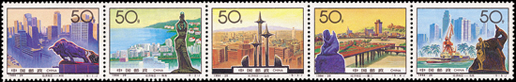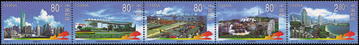 深圳位于我國南部地區(qū),擁有海洋的地理優(yōu)勢,深圳是中國改革開放后設立的第一個經濟特區(qū),經過20年的努力,昔日的邊陲小鎮(zhèn)現(xiàn)已發(fā)展成為一個經濟繁榮,社會全面進步的現(xiàn)代化國際大都市。郵票中可以看出現(xiàn)代化的高樓大廈,活動中心等建筑物,整個城市現(xiàn)代感十足,被譽為中國改革開放的窗口。該套郵票由于萬新、張雪峰設計,于2000年8月26日發(fā)行。