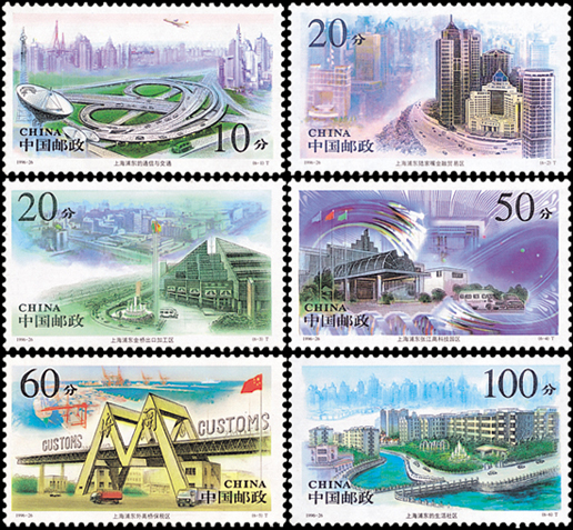 浦東緊靠上海市區(qū),位于黃浦江東側,長江口西南,川揚河以北。1990年國務院制訂了開發(fā)浦東,把上海建設成國際航運中心,國際經濟、金融、貿易中心之一的宏偉計劃。如今浦東新區(qū)建設已取得了巨大成就。該套郵票由李斌、楊順泰、張安樸設計,1996年9月21日發(fā)行。