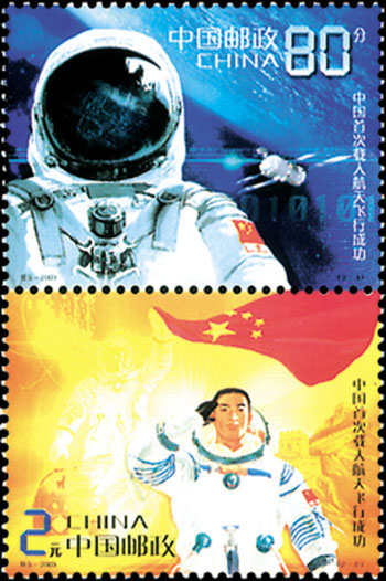 2003年10月16日,為紀念我國首次載人航天飛行成功,中國郵政特別發(fā)行了《中國首次載人航天飛行成功》紀念郵票1套2枚。第一枚為“英姿”,畫面主圖為身著宇航服的航天員形象,背景為“神舟”五號載人飛船翱翔太空的靚影和深邃浩淼的太空。第二枚為“凱旋”,畫面主圖為身著宇航服的航天員走出返回艙敬禮時的形象,背景由國旗、長城、宇航員、返回艙和飛船運行軌跡組成。該套郵票由王虎鳴、劉向平設汁。