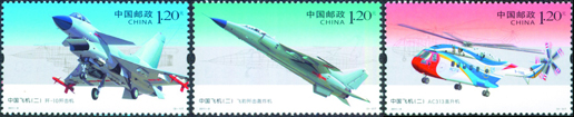 2011年4月17日,新中國航空工業(yè)創(chuàng)建60周年之際,中國郵政發(fā)行《中國飛機(二)》特種郵票1套3枚,郵票內容分別為“殲-10殲擊機”、“飛豹殲擊轟炸機”、“AC313直升機”。該套郵票由方軍、孟慶晨設計。
