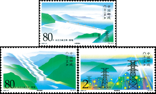 長江三峽地處三角地帶,地勢險峻,水流湍急。2003年,我國為了經濟發(fā)展的需要,決定開啟長江三峽工程,利用水能進行發(fā)電,這套特種郵票便架構了水庫蓄水 、船閘通航、 電站發(fā)電這3個過程,表達了對三峽發(fā)電的美好愿景。該套郵票由陳楠設計,2003年8月20日發(fā)行。