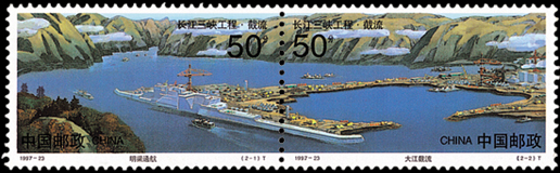 1997年11月8日,為紀念長江三峽工程大江截流成功,郵電部發(fā)行了《長江三峽工程·截流》特種郵票1套2枚。第一枚為“明渠通航”,圖案為位于長江三峽工程中堡島右側的導流明渠,該渠既是二期施工期唯一的泄水河道,也是該時期中枯水季的重要航運通道。第二枚為“大江截流”,圖案為位于長江三峽工程中堡島左側的大江截流主體。該套郵票以連票形式展示了明渠通航和大江截流的壯觀場景,由徐勇民、王涌、劉壽祥、宋克靜設計。