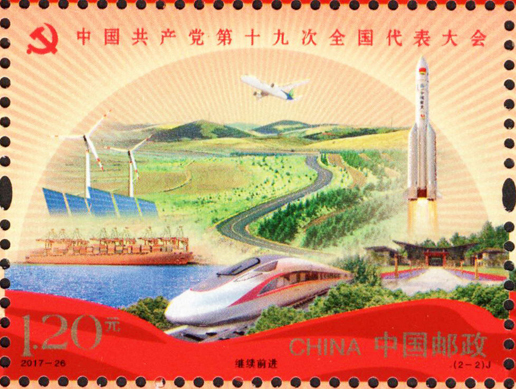 中國共產黨第十九次全國代表大會于2017年10月18日至10月24日在北京召開。這次大會的主題是:不忘初心,牢記使命,高舉中國特色社會主義偉大旗幟,決勝全面建成小康社會,奪取新時代中國特色社會主義偉大勝利,為實現(xiàn)中華民族偉大復興的中國夢不懈奮斗。黨的十九大,是在全面建成小康社會決勝階段、中國特色社會主義發(fā)展關鍵時期召開的一次十分重要的大會。承擔著謀劃決勝全面建成小康社會、深入推進社會主義現(xiàn)代化建設的重大任務,事關黨和國家事業(yè)繼往開來,事關中國特色社會主義前途命運,事關最廣大人民根本利益。為紀念中國共產黨第十九次全國代表大會的召開,中國郵政發(fā)行紀念郵票一套2枚,小型張1枚。郵票圖案內容分別為:不忘初心、繼續(xù)前進,小型張內容為筑夢。該套郵票由馬立航設計,于2017年10月18日發(fā)行。