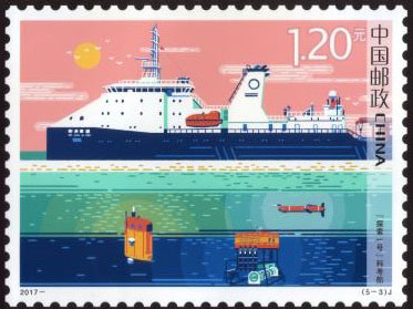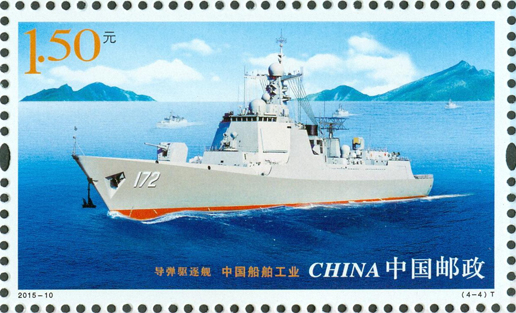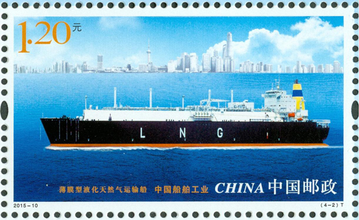 2015年6月3日,中國郵政發(fā)行《中國船舶工業(yè)》特種郵票1套4枚,內容分別為航天測量船、薄膜型液化天然氣運輸船、海上浮式生產儲油船、導彈驅逐艦。該套郵票遴選了代表我國造船先進水平的、不同類型的船舶,以橫向陳列的方式展示了船舶優(yōu)美的形態(tài)和龐大的規(guī)模。畫面氣氛的營造不僅突出船舶工作的環(huán)境,還強調船舶在現(xiàn)代化建設中所承擔的功能。郵票畫面整體布局均衡、協(xié)調,層次清晰,空間感強。該套郵票由史淵設計。