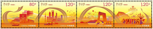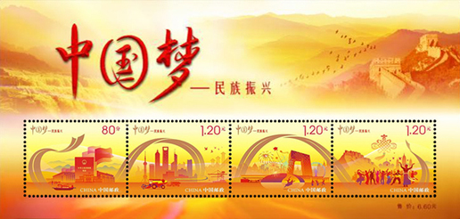 2014年9月20日,中國郵政發(fā)行《中國夢—民族振興》特種郵票一套4枚,小全張1枚。郵票內容分別為政治文明、經濟發(fā)展、文化繁榮、民族團結。該套郵票由何潔、周岳、陳楠設計。