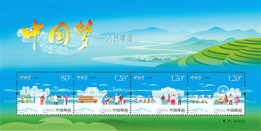 2015年7月25日,為深入揭示“中國夢”的本質內涵,進一步弘揚中國精神,凝聚中國力量,中國郵政發(fā)行了《中國夢—人民幸?!诽胤N郵票一套4枚。郵票內容分別為安居樂業(yè)、社會保障、社會和諧、美好生活。該套郵票畫面以藍天為背景,通過一幅幅插畫描繪出一派和諧祥和的場景,營造出一幅人民幸福的美好愿景,藝術地反映了“中國夢—人民幸?!钡闹黝}。該套郵票由何潔、周岳設計。