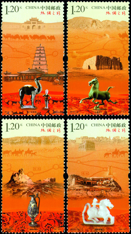 2012年8月1日,中國郵政發(fā)行《絲綢之路》特種郵票一套4枚,小型張1枚。郵票內容分別為千年帝京、大漠雄關、神秘故國、西域勝境,小型張內容為交流。該套郵票由陳景異、惠斌、李群設汁。