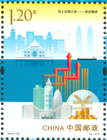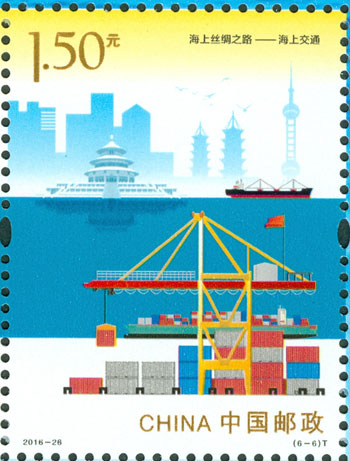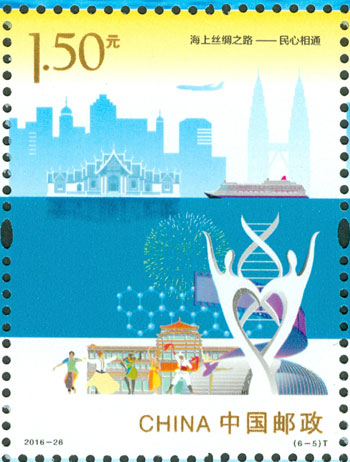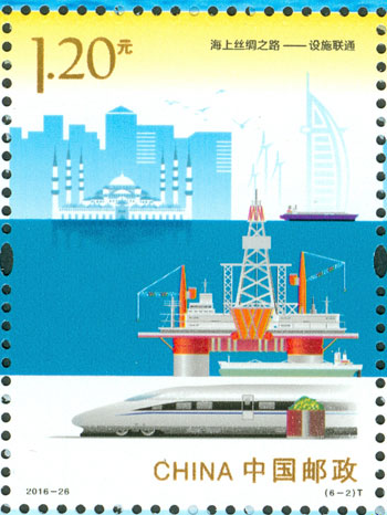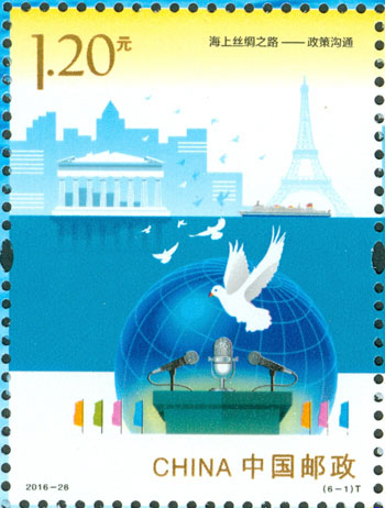 2016年9月10日,中國郵政發(fā)行《海上絲綢之路》特種郵票一套6枚,小全張1枚,郵票內容分別為:政策溝通、設施聯(lián)通、貿易暢通、資金融通、民心相通、海上交通。該套郵票采用六枚聯(lián)票形式設計,以畫面中部的海平面進行串聯(lián),將畫面分割為前景主題與背景。小全張邊飾以海洋為背景。晨光初現(xiàn),燈塔指引的燈光尚未熄滅,一輪紅日由海平面冉冉升起,喻示著21世紀海上絲綢之路的嶄新開始與光明前景。該套郵票由何潔、周岳設計。