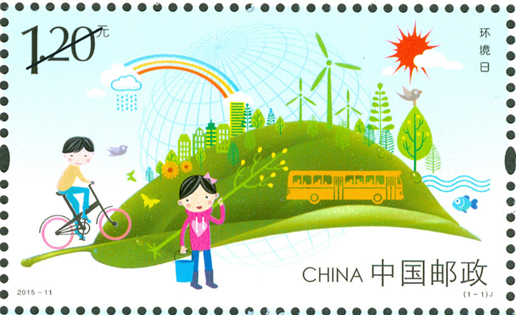 2015年6月5日是新修訂的《中華人民共和國環(huán)境保護法》實施后的首個“環(huán)境日”。中國郵政發(fā)行《環(huán)境日》紀念郵票1套1枚,郵票采用卡通漫畫的形式,描繪了一幅綠色生態(tài)、環(huán)保宜居的生活環(huán)境,以郵票為媒介倡導社會可持續(xù)發(fā)展的生活方式,鼓勵和支持新能源的開發(fā)利用,傳遞積極向上、健康的生活態(tài)度。該套郵票由李志宏設計。