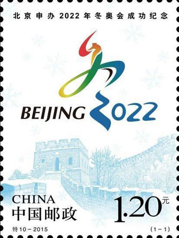 2015年7月31日,北京成功獲得2022年第24屆冬奧會舉辦權,舉國上下一片沸騰。為紀念北京這次申辦冬奧會成功,中國郵政于31日晚上特別發(fā)行一枚《北京申辦2022年冬奧會成功紀念》郵票。郵票設計突出表現(xiàn)了北京申辦2022年冬奧會的標志,同時輔以白雪覆蓋的長城為襯托,帶給人們冬季白雪茫茫的視覺感受。該套郵票由夏競秋設計。