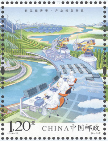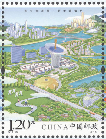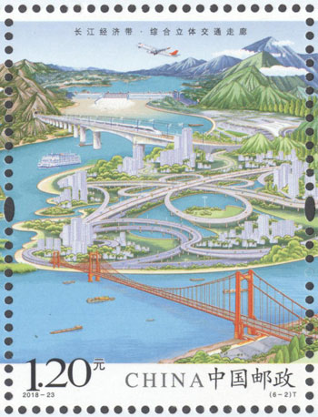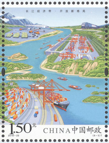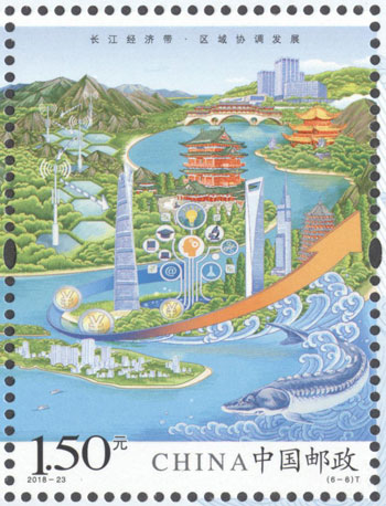2018年8月26日,中國郵政發(fā)行《長江經濟帶》特種郵票1套6枚,小全張1枚。郵票圖案名稱分別為:共抓大保護、綜合立體交通走廊、產業(yè)轉型升級、新型城鎮(zhèn)化、開放新格局、區(qū)域協(xié)調發(fā)展。郵票以手繪方式生動展示了長江經濟帶全方位的發(fā)展成就。第一圖描繪了長江經濟帶共抓大保護的發(fā)展理念和美麗的自然生態(tài)。第二圖展現(xiàn)了長江經濟帶科學高效的綜合立體交通走廊。第三圖展示了長江經濟帶產業(yè)轉型升級,加速培育新動能。第四圖描繪了長江經濟帶以人為本的新型城鎮(zhèn)化。第五圖展現(xiàn)了長江經濟帶的開放新格局。第六圖描繪了長江經濟帶的區(qū)域協(xié)調發(fā)展。郵票設計者為鄒慶。