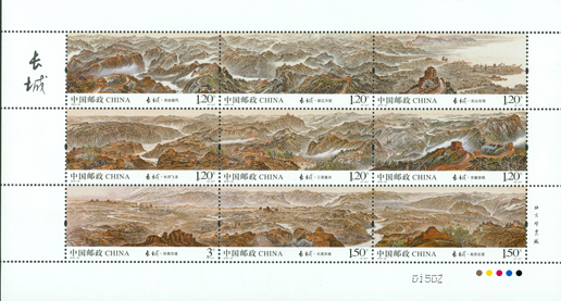 中國郵政于2016年8月20日發(fā)行《長城》特種郵票1套9枚,圖案內容分別為: 關山滄海、薊遼天塹、燕趙雄風、京畿屏障、三晉重關、長河飛龍、高原北望、大漠關城、絲路古道。該套郵票以九圖連票的形式全景展現(xiàn)了明代長城沿線的自然風貌和人文景觀,局部細膩嚴謹、整體大氣磅礴,表現(xiàn)了長城氣勢之雄偉、歷史之悠久。該套郵票由著名畫家許仁龍、張濟平共同設計。