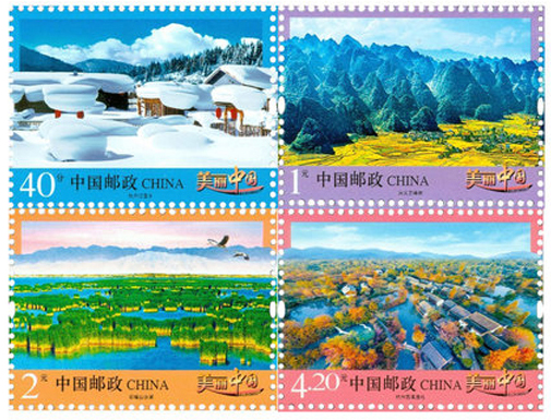 中國郵政于2016年5月12日發(fā)行《美麗中國》(二)普通郵票一套4枚,圖案內容分別為: 牡丹江雪鄉(xiāng)、興義萬峰林、石嘴山沙湖、杭州西溪濕地?!睹利愔袊菲胀ㄠ]票第二組延續(xù)了第一組的設計風格,選取我國東南西北各地風光,其地貌差別大,風景多樣,方寸之上展示了我國的幅員遼闊,山川秀美。該套郵票由馬立航設計。