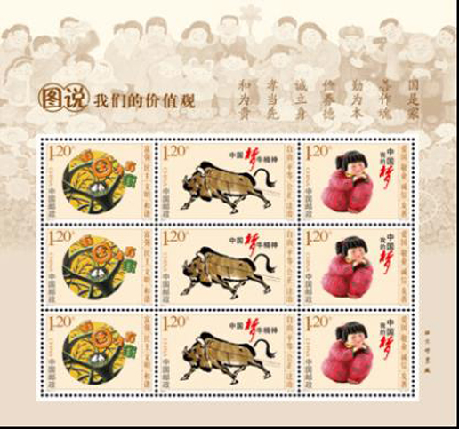 2015年11月29日,中國郵政發(fā)行《圖說我們的價值觀》特種郵票一套3枚。郵票內容選取了“鳥巢”“牛精神”“夢娃”三個畫面,文化形式豐富多彩,內容積極向上,形象地宣傳和闡述了社會主義核心價值觀。該套郵票由夏競秋設計。
