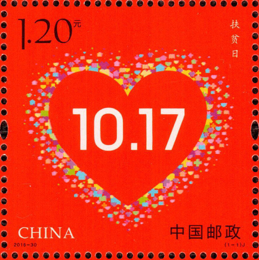 2016年10月17日是我國的第3個扶貧日,中國郵政發(fā)行《扶貧日》紀念郵票一套1枚。郵票設計以國旗紅為底色,將衣、食、住、醫(yī)、學等符號組合成心形——寓意兩不愁(不愁吃、不愁穿)、三保障(義務教育、基本醫(yī)療、住房),中間為扶貧日的日期10.17。整個設計寓意深刻,表達了全社會對扶貧工作的高度重視和積極參與。該套郵票由何潔、周岳設計。