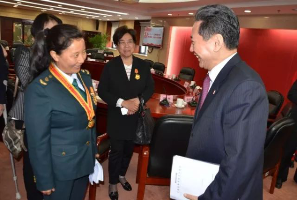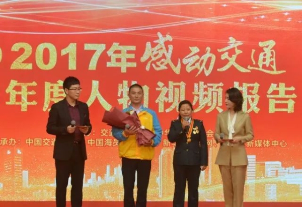 在2017年感動交通十大年度人物視頻報告會上,尼瑪拉木為見義勇為的上海蘇寧物流有限公司快遞員翟秋云獻(xiàn)上鮮花,并號召全國郵政快遞從業(yè)人員向他學(xué)習(xí)。