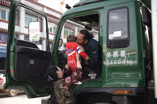 中國郵政甘孜縣分公司郵運駕駛組組長其美多吉依舊駕駛著郵車,往返在甘孜縣與德格縣之間。這段路程是四川省甘孜州綿延5866公里、平均海拔超過3500米的雪線郵路最危險的一段。而其美多吉,是這條郵路上堅守了29年的“航標”。圖為出發(fā)前,澤仁曲西將孫子舉到丈夫其美多吉跟前,讓祖孫倆告別。