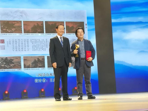 國家郵政局局長(zhǎng)馬軍勝、中國郵政集團(tuán)公司董事長(zhǎng)劉愛力為優(yōu)秀郵票獎(jiǎng)獲獎(jiǎng)?wù)哳C獎(jiǎng)。