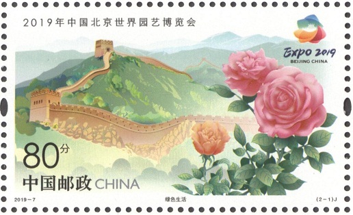 《2019年中國北京世界園藝博覽會》紀(jì)念郵票一套2枚,郵票圖案名稱分別為:綠色生活、美麗家園。郵票第一圖畫面以在青山間蜿蜒的長城、北京市市花——月季以及本次世園會的會徽——長城之花為主要元素,寓意園藝源于自然,倡導(dǎo)尊重自然、融入自然的理念,也突出了“中國風(fēng)格”和“北京品牌”;郵票第二圖畫面以本次世園會國際館、中國館以及吉祥物“小萌芽”“小萌花”為主要元素,整體畫面生機(jī)盎然、朝氣蓬勃,啟示人們應(yīng)當(dāng)樹立綠色、低碳、環(huán)保的生產(chǎn)生活理念。