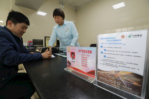 紅色文化激勵著一代又一代平山郵政人艱苦創(chuàng)業(yè)、拼搏奮斗,為廣大用戶提供著不斷創(chuàng)新的郵政服務。圖為柏坡東路郵政支局黨員蓋凌霄在服務用戶。