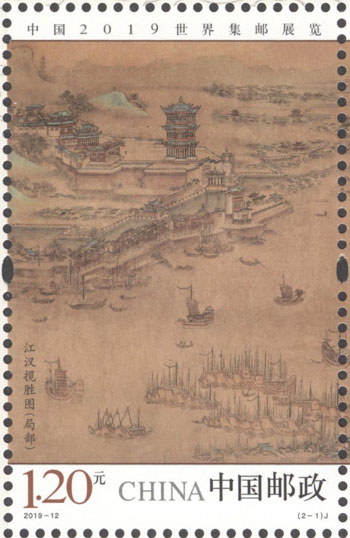 《江漢攬勝圖》是明代絹本國畫,國家一級文物,現(xiàn)藏于武漢博物館。畫面中心內容為長江、漢水交匯及水上船只通行景象,漢陽晴川閣與武昌黃鶴樓隔江相望。這幅畫集中表現(xiàn)了武漢最為重要的地理、人文風貌,體現(xiàn)武漢悠久歷史文化的同時,也飽含了世界郵展匯聚八方來客的喻義。