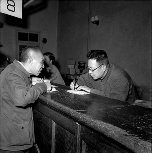 1958年4月,北京東四郵電局,在郵局工作了30多年的于鴻澤(圖右)積極為顧客填寫單據(jù)。工人日?qǐng)?bào) 杜治 攝