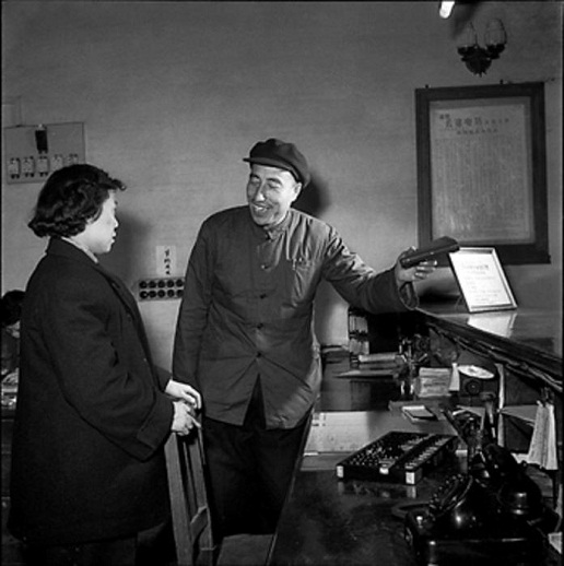 1958年4月,北京市郵局東城區(qū)局長(zhǎng)兼黨總支書記劉桂馨(右),在東四郵電局指導(dǎo)營(yíng)業(yè)員工作。工人日?qǐng)?bào) 杜治 攝