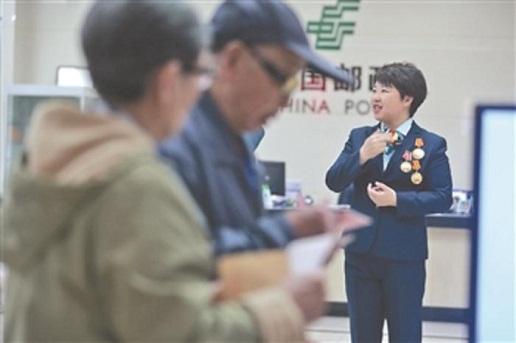 當(dāng)天上午,作為局長(zhǎng)助理的陳蘭穎也在忙乎著,一天下來(lái),光在郵局大樓里就走了1萬(wàn)多步??熘形鐣r(shí),來(lái)了一位聾啞人,陳蘭穎上前和他用手語(yǔ)交流,一直陪他辦理完業(yè)務(wù)。陳蘭穎喜歡把東四郵局說(shuō)成是“家”:“我們局就像一個(gè)大家庭,我在這個(gè)家感覺(jué)特別舒心,我們還要把這種舒心傳遞給用戶,讓大家都舒心。”