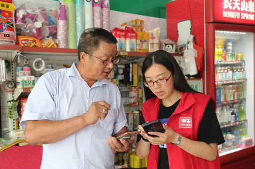 地推員陳萍(右)教掌柜使用“郵掌柜”APP系統(tǒng)。