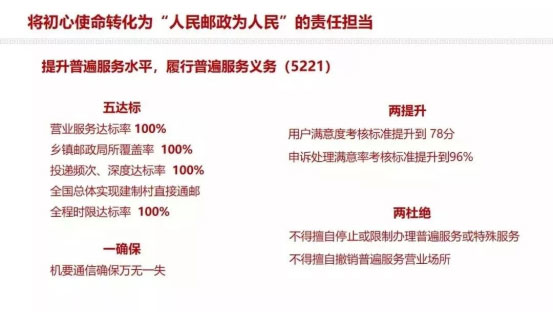 普遍服務(wù)是黨和國家賦予郵政企業(yè)的神圣使命,是法律性制度安排,是中國郵政的政治責(zé)任和政治擔(dān)當(dāng)。做好普遍服務(wù):是厚植黨的執(zhí)政基礎(chǔ)的需要,是貫徹以人民為中心的思想的需要,是體現(xiàn)企業(yè)自身責(zé)任的需要,是獲得國家支持、社會(huì)認(rèn)可的需要,是獲得人民信賴、建立發(fā)展優(yōu)勢的需要,是協(xié)同發(fā)展、做優(yōu)做強(qiáng)做大中國郵政的需要。