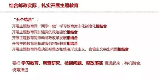 劉愛力提出,開展主題教育要做到“五個(gè)結(jié)合”:開展主題教育同“兩學(xué)一做”學(xué)習(xí)教育常態(tài)化制度化相結(jié)合,同加強(qiáng)黨的政治建設(shè)相結(jié)合,同推動(dòng)郵政改革發(fā)展相結(jié)合,同郵政服務(wù)宗旨教育相結(jié)合,同推動(dòng)巡視整改和整治形式主義、官僚主義突出問題相結(jié)合。他深入闡述了如何將學(xué)習(xí)教育、調(diào)查研究、檢視問題、整改落實(shí)貫通起來,有機(jī)融合,統(tǒng)籌推進(jìn)。