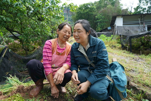 在美麗的石斛花田中,孫茂梅向種植戶了解藥效和石斛的長(zhǎng)勢(shì)。
