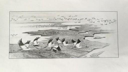 “這枚郵票是整套郵票中創(chuàng)作設(shè)計難度最大,也是修改次數(shù)最多的?!睏罾蠋熃榻B,起先并不清楚東方白鸛與白鶴的差別,經(jīng)過專家的詳盡介紹才了解到,白鶴飛時翅膀是展開的、有些分散,而白鸛飛時翅膀仍然比較整齊。在后期修改時,白鸛的特寫和造型單獨畫了好幾次,再借用電腦進行合成處理。山與水、湖與江、鳥與草,為了前后照應(yīng),楊老師在該枚郵票上運用了一些西洋手法,實現(xiàn)了中西合璧。