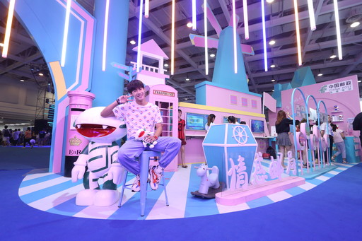 以淺藍(lán)、粉紅為主色調(diào)的郵政展區(qū)撥動(dòng)了無數(shù)少女的心,cosplay模特也前來體驗(yàn)。