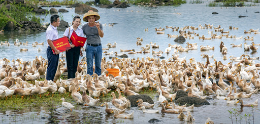 圖為海南省臨高縣新盈鎮(zhèn)養(yǎng)鴨農(nóng)戶張建軍(右)在郵儲(chǔ)銀行家庭農(nóng)場(chǎng)貸款的支持下,養(yǎng)鴨數(shù)量超過一萬(wàn)只,預(yù)計(jì)今年收入可觀?! 醴掠?nbsp; 攝影報(bào)道