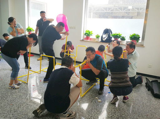 “呼吸的力量”環(huán)節(jié)中,每個(gè)小組得到一張“呼吸機(jī)”的搭建圖紙和部分搭建材料,僅有一位組員可看見(jiàn)圖紙,需向其他組員描述圖紙內(nèi)容,并配合大家搭建好“呼吸機(jī)”。“指壓板上的挑戰(zhàn)”環(huán)節(jié)中,下設(shè)雙人跳繩、背重物、“人體錘”等幾個(gè)小項(xiàng)目。兩個(gè)項(xiàng)目均考驗(yàn)了團(tuán)隊(duì)的溝通能力、信息傳達(dá)效率、執(zhí)行力和凝聚力?! 鯒罟?nbsp; 張建勤 攝影報(bào)道